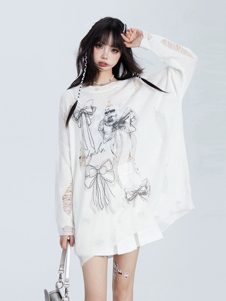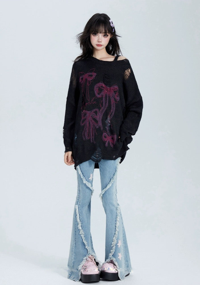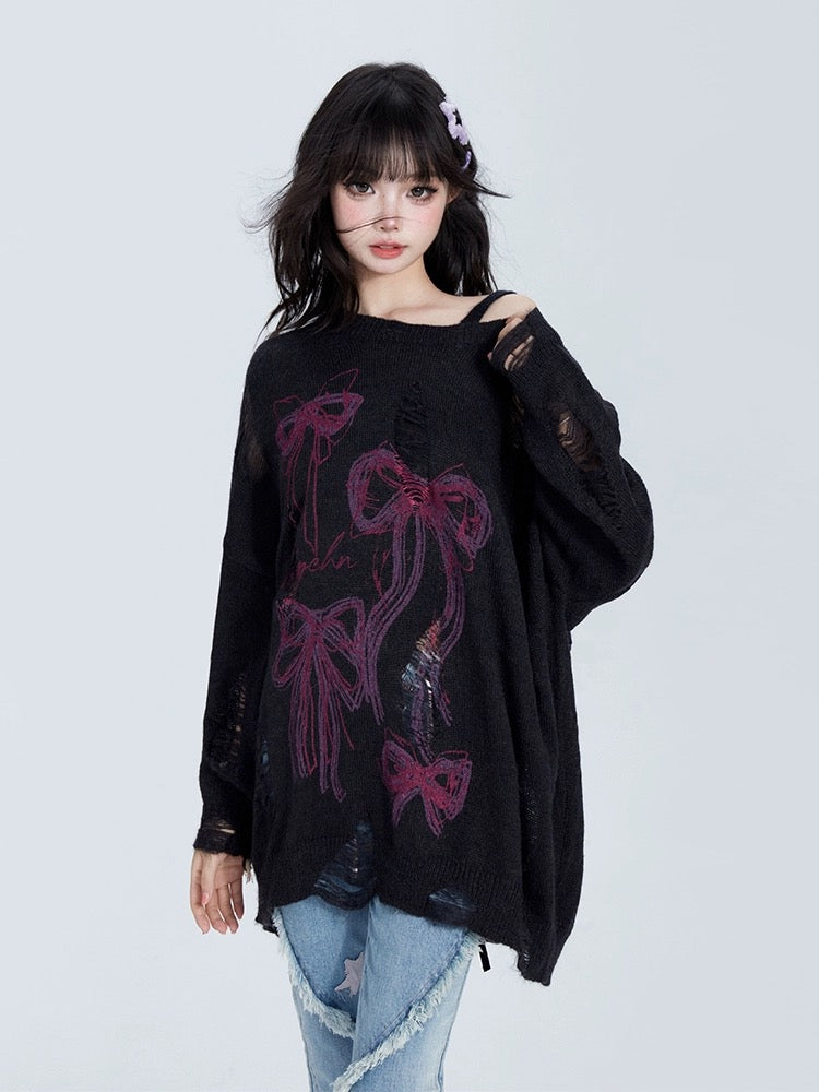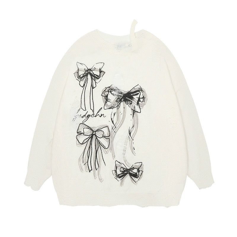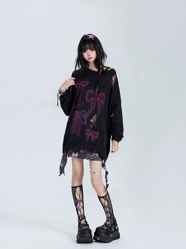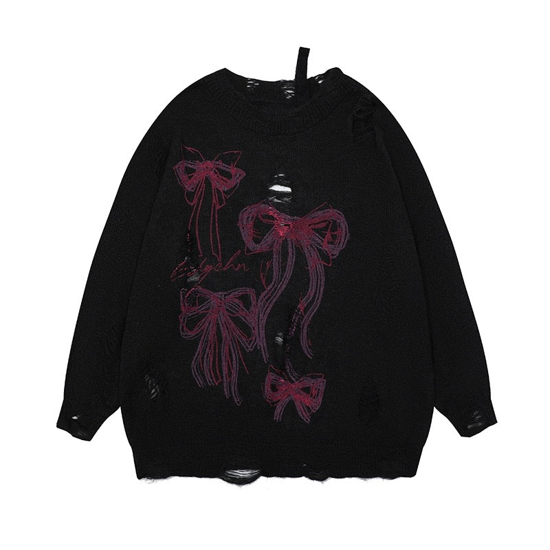 ゴシックリボンセーターは、フロントに大きなリボンデザインが特徴の、エッジの効いたスタイルのニットです。柔らかい素材で作られており、快適な着心地を提供します。大胆なディストレストディテールが施されており、個性的なファッションステートメントを演出します。リラックスしたシルエットで、様々なボトムスと合わせやすい一枚です。
