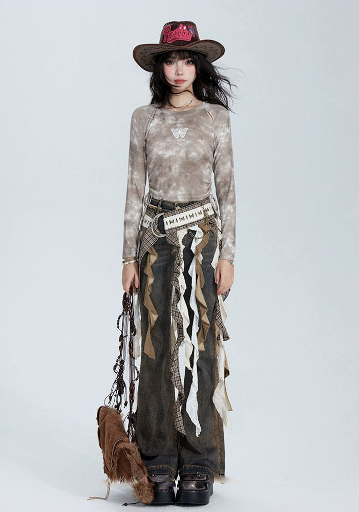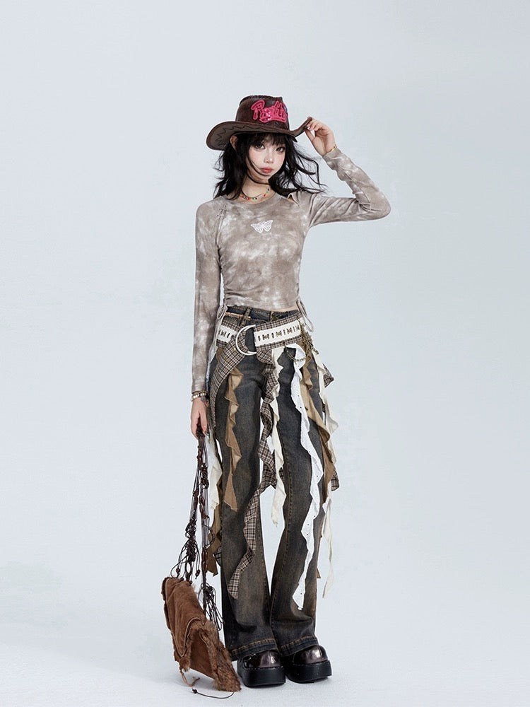 Tie-Dye Butterfly Long Sleeve Top / タイダイ バタフライ ロングスリーブ トップスは、タイダイ染めが施された長袖トップスです。フロントには可愛らしい蝶のデザインがあしらわれており、個性的でおしゃれな印象を与えます。柔らかな素材を使用しており、着心地も抜群です。リラックスフィットで、さまざまなスタイルに合わせやすい一枚です。