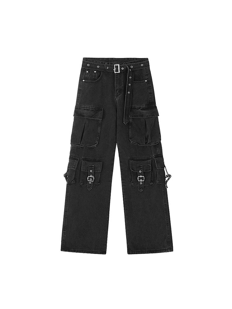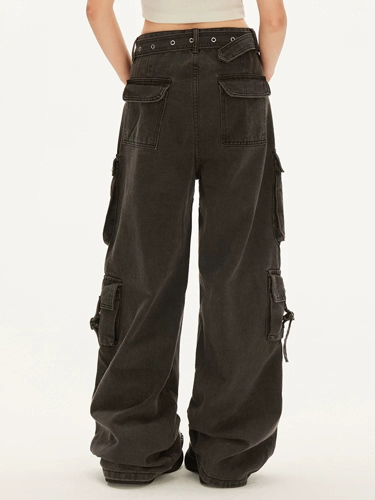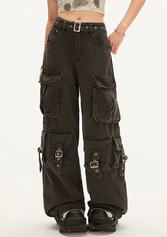 マルチポケットカーゴパンツは、複数のポケットとストラップが特徴のワイドレッグデザインのカーゴパンツです。ゆったりとしたフィット感で、ストリートウェアやユーティリタリアンスタイルに最適です。