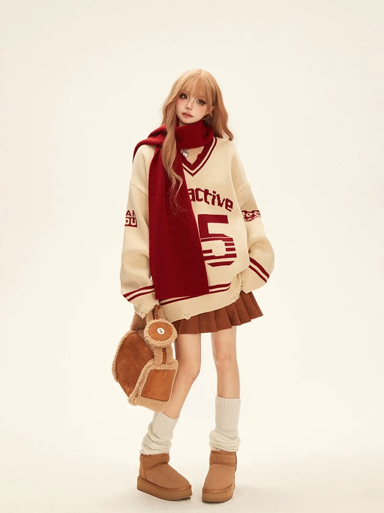 “Active Varsity Oversized Sweater / アクティブ バーシティ オーバーサイズド スウェーター” は、ビンテージ感漂うカレッジスタイルのセーターです。クリーム色とレッドの配色で、前面と袖には大きな数字と文字が刺繍されており、クラシックなアメリカンスポーツウェアの雰囲気を漂わせます。
