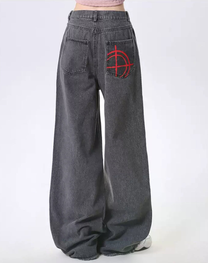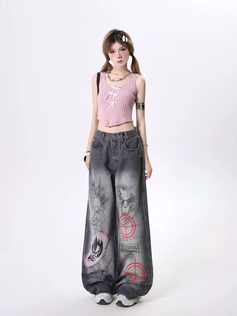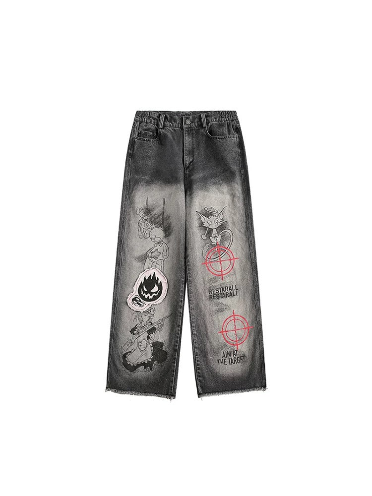 Urban Graffiti Wide Denim Pants / アーバン グラフィティ ワイド デニムパンツは、個性的なグラフィックデザインが特徴のワイドデニムパンツです。ユニークなイラストとターゲットマークがストリートスタイルにぴったりのアクセントとなり、全体にヴィンテージ感のあるウォッシュ加工が施されています。ゆったりとしたシルエットで、カジュアルなスタイリングに最適です。